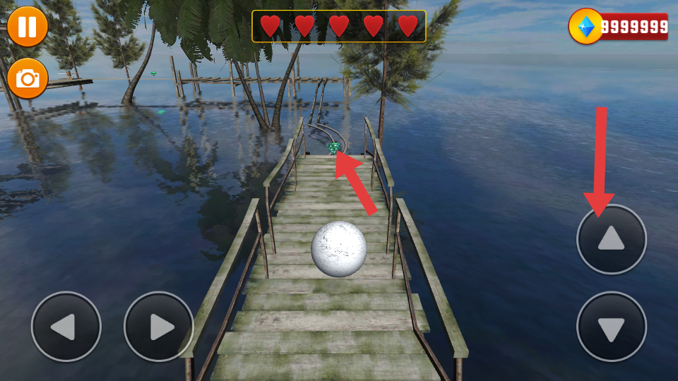 2、繼續操控小球,遇到木橋缺口,利用左右和前后按鈕,讓小球精準跨越缺口,避免掉落水中,同時留意寶石位置。