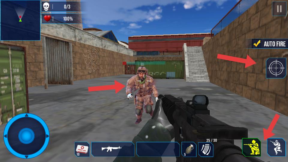 4、游戲中操控角色移動,瞄準敵人射擊,可使用自動射擊,瞄準等功能,還有武器,手雷等道具可用,完成擊殺目標等任務。