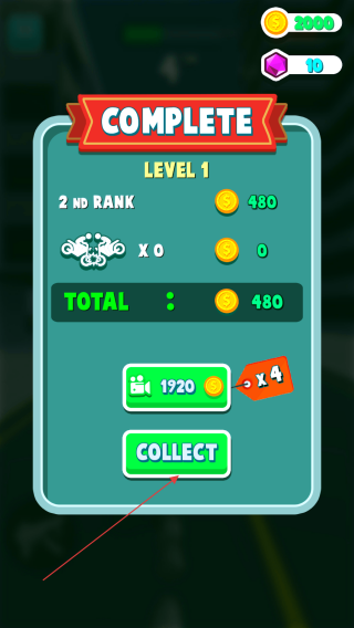 4、完成關卡后會顯示關卡完成提示,以及你在關卡中的排名,點擊COLLECT按鈕領取獲得的金幣等獎勵。