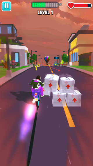 3、在行駛過程中留意道路上帶有箭頭標識的箱子,操控摩托車需要躲避這些障礙物,避免游戲失敗。