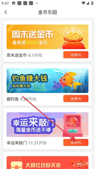 2、在活動列表中找到幸運來敲門海量金幣送不停活動,點擊其右側的去參與按鈕,進入抽獎活動頁面。