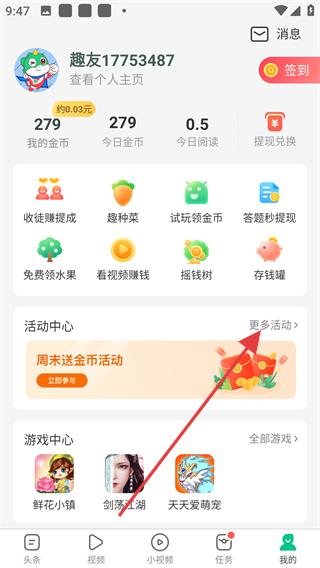 1、打開趣頭條軟件,點擊底部導航欄中的我的選項,進入個人頁面后,找到活動中心區域,點擊更多活動按鈕,進入活動列表頁面。