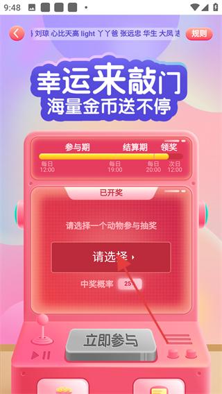 3、在抽獎活動頁面,點擊請選擇按鈕,選擇一個動物參與抽獎,選擇完成后,點擊立即參與按鈕,參與抽獎。