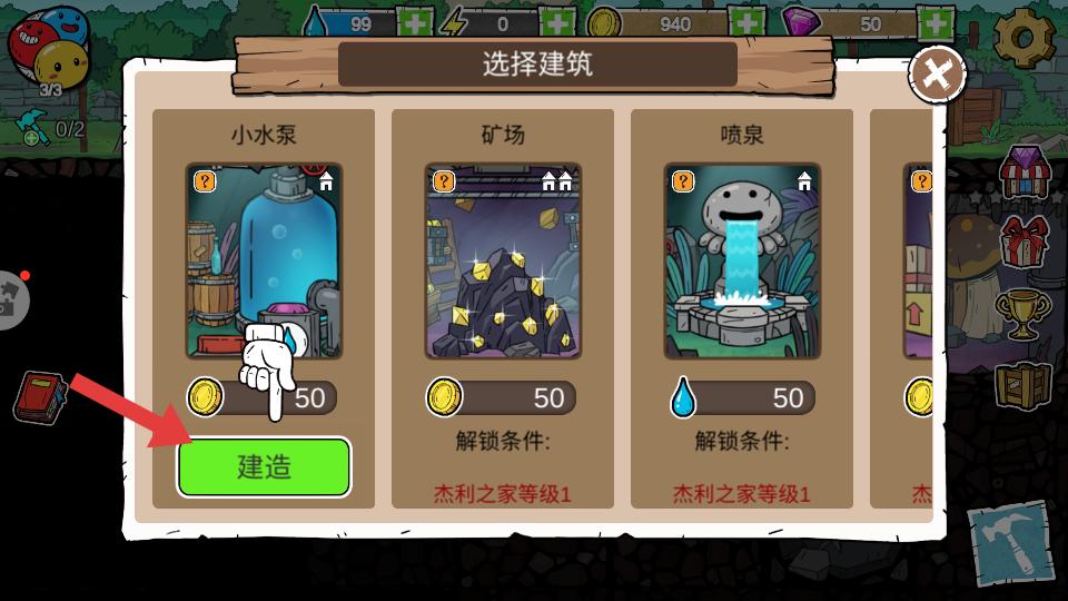 2、在建筑選擇界面,可挑選小水泵,礦場,噴泉等建筑,滿足解鎖條件后,花費對應資源點擊建造,打造各類建筑。