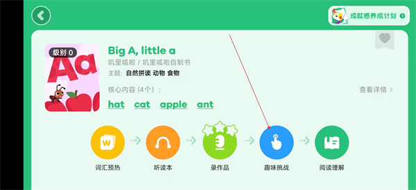 2、在繪本學習頁查看核心內容及配套功能,選擇趣味挑戰選項,進入詞匯匹配的互動環節,開始完成對應的學習任務。