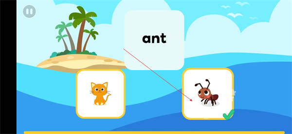 4、繼續完成后續單詞的匹配,比如ant對應的螞蟻圖案,點擊正確選項后,完成該輪趣味挑戰的學習任務。