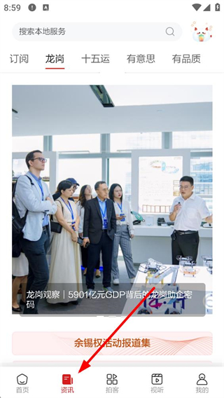 4、點擊首頁底部資訊按鈕,可看到訂閱、龍崗、十五運等分類,能瀏覽如龍崗觀察等本地資訊報道,了解區域發展動態。