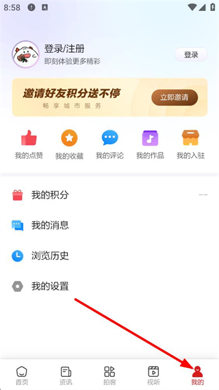 2、點擊首頁底部我的按鈕,進入個人頁面,可進行登錄注冊,還能查看我的點贊、收藏、評論等內容,管理個人積分、消息、瀏覽歷史和設置。