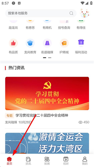 1、進入APP首頁,可看到搜索本地服務欄,還有趣龍崗、有意思等多個功能入口,下方有熱門資訊板塊,能了解各類本地信息。