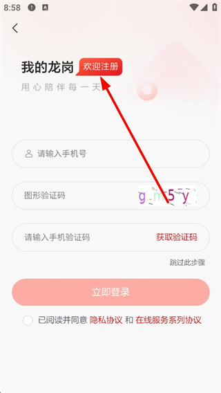 3、登錄注冊頁面,顯示我的龍崗歡迎注冊,需輸入手機號、圖形驗證碼、手機驗證碼,勾選協議后可立即登錄,也可跳過此步驟。
