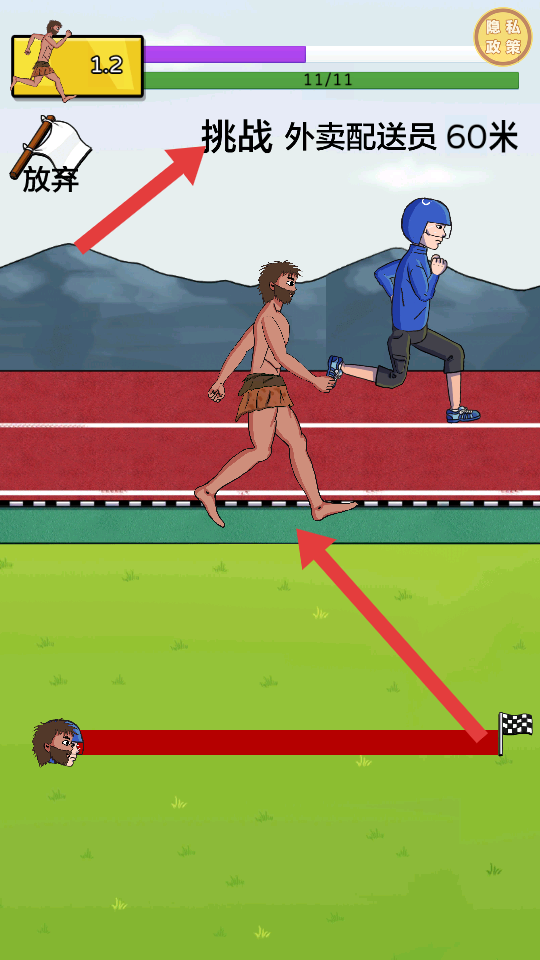 4、進入競賽場景,人物和對手在跑道上奔跑,要努力跑贏對手,若不想繼續,也可點擊放棄結束競賽。