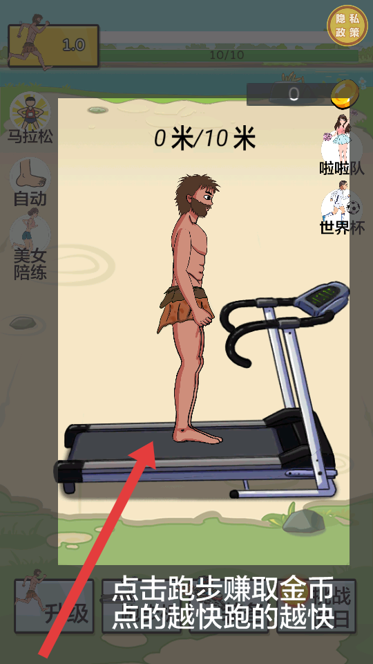 1、進入游戲,操控人物在跑步機上跑步,點擊速度越快,人物跑得也越快,還能通過跑步賺取金幣。