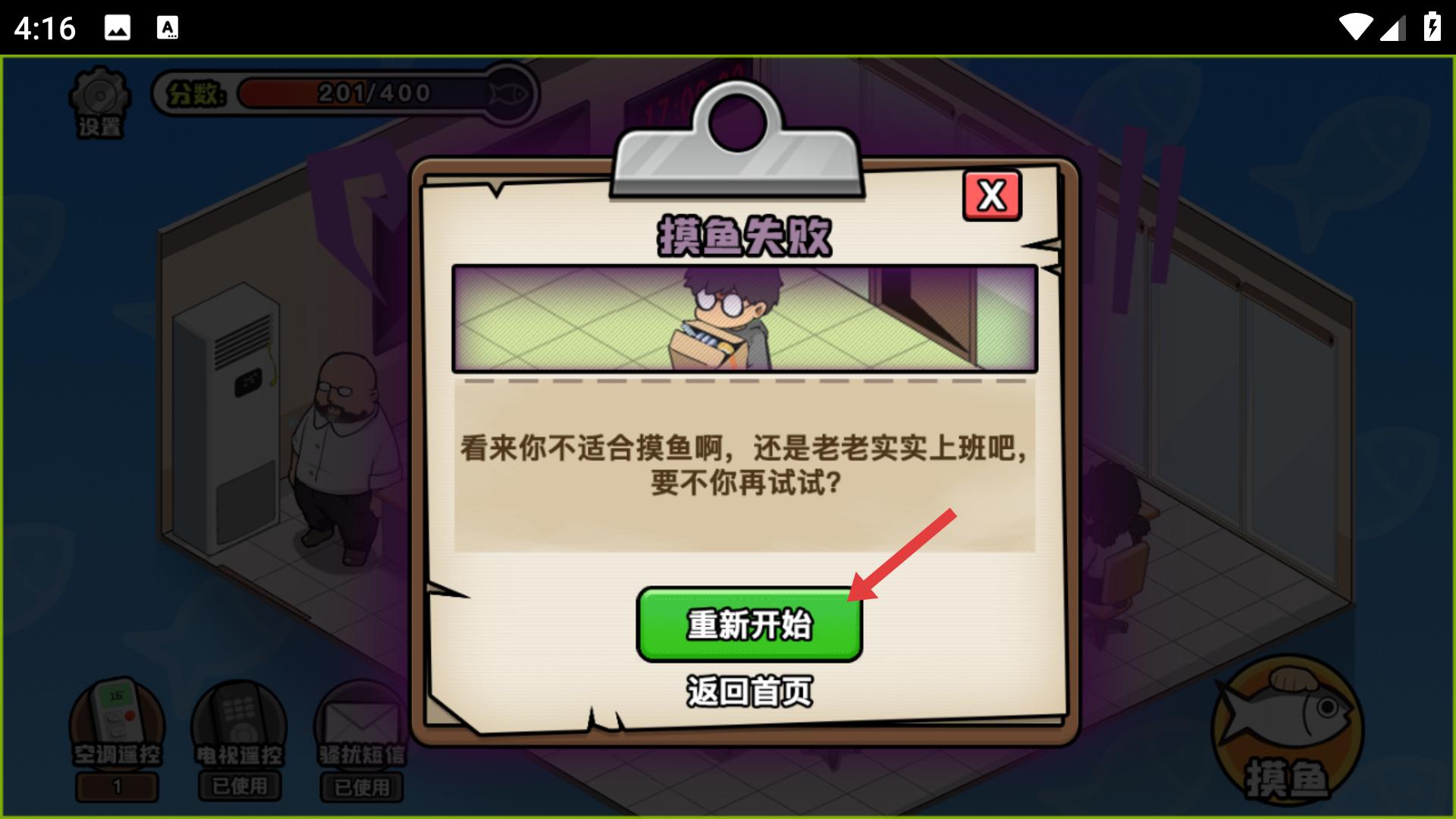 4、若摸魚失敗,界面會彈出摸魚失敗提示,點擊重新開始,可再次挑戰摸魚,繼續嘗試成功摸魚,積累摸魚天數。