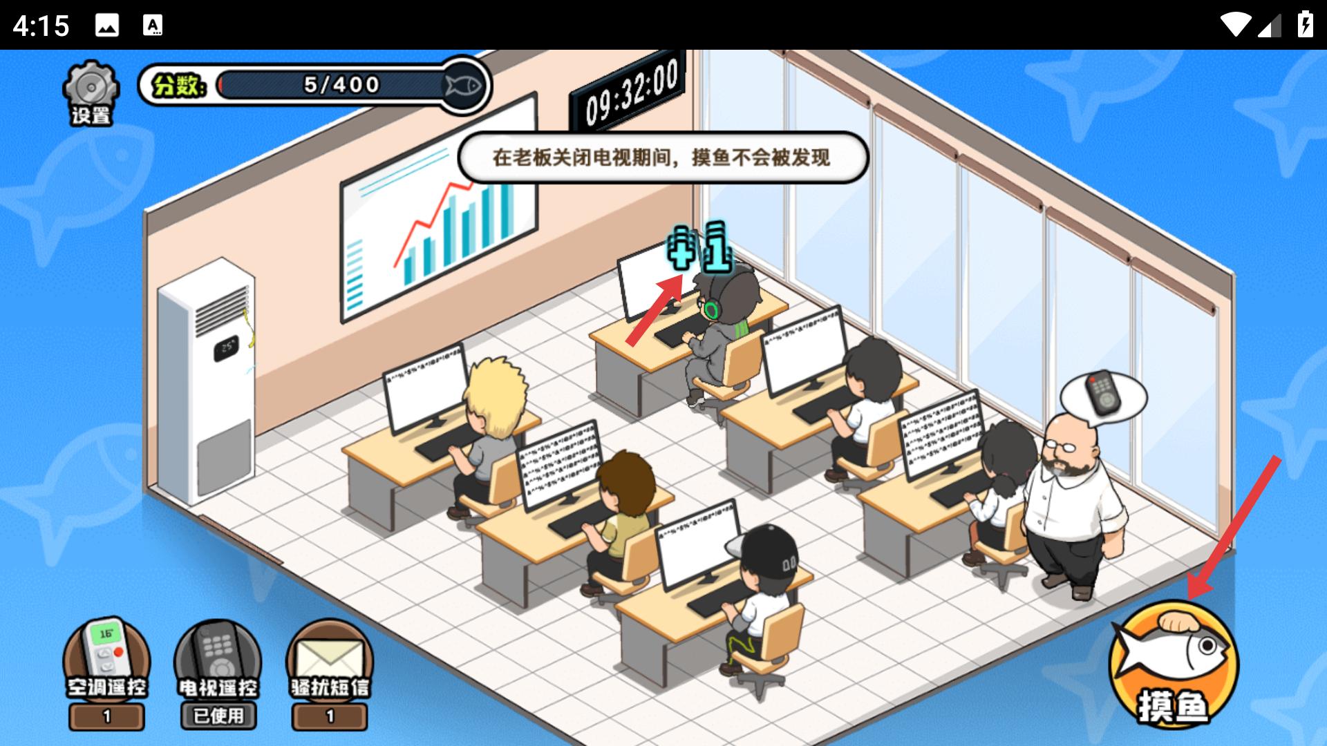 2、在老板關閉電視期間,抓住時機點擊摸魚按鈕,此時摸魚不會被發現,可安全積累分數,推進摸魚進程。