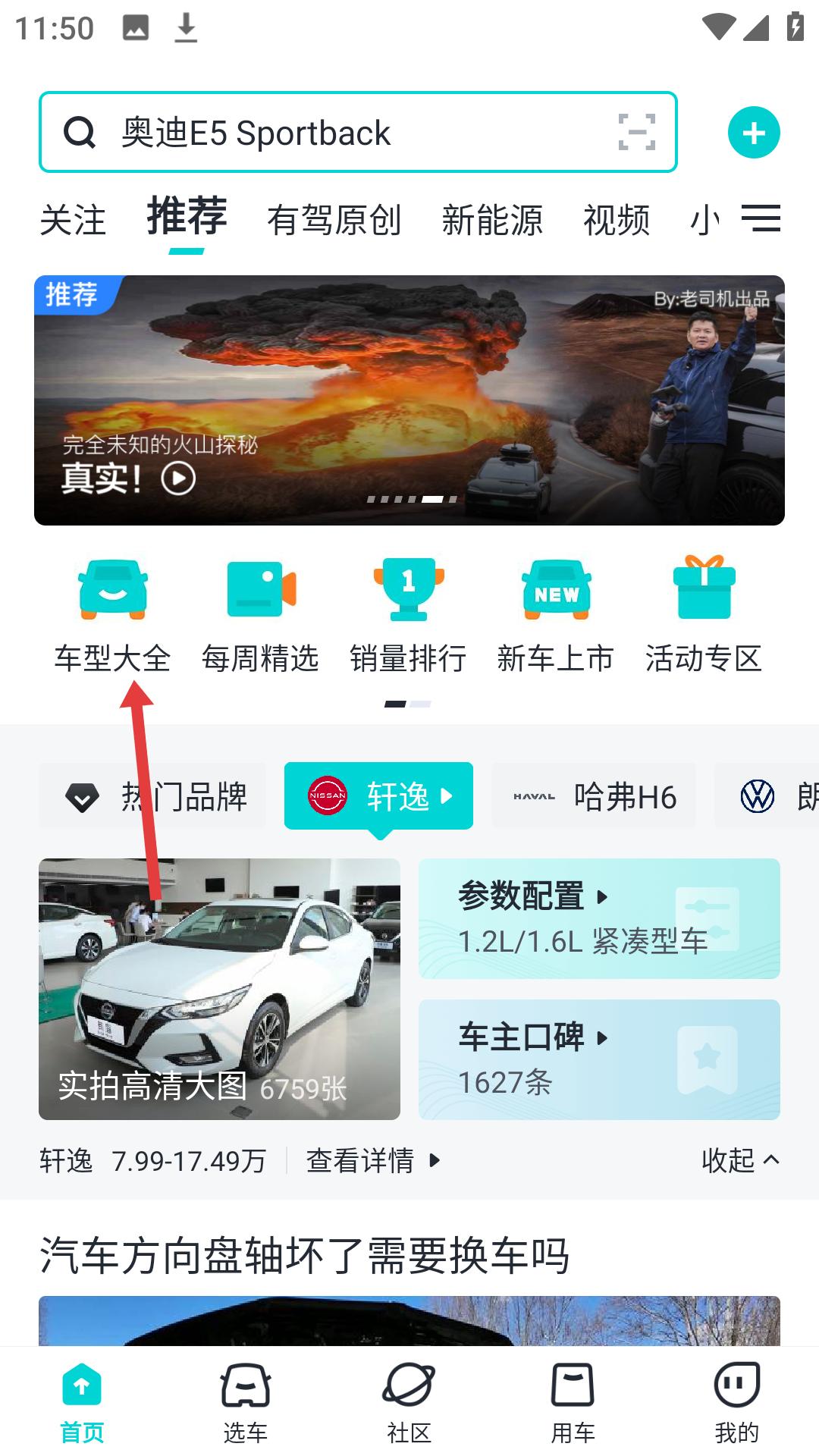 1、在汽車類軟件首頁,點擊車型大全選項,可進入車型分類頁面,開始查找各類汽車車型。