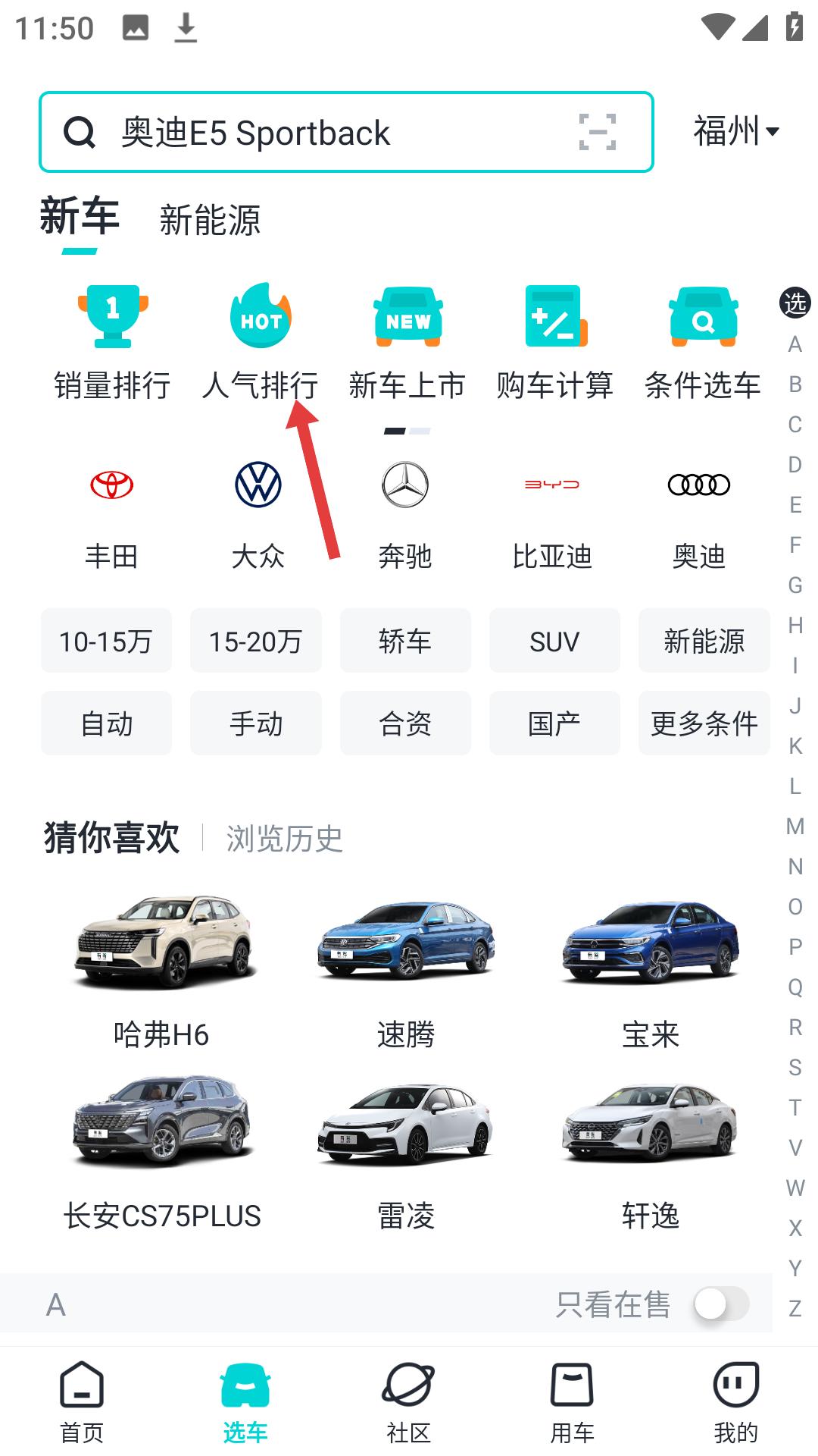 2、進入車型分類頁面后,點擊人氣排行選項,可查看當前熱門汽車的人氣排名,了解熱門車型情況。
