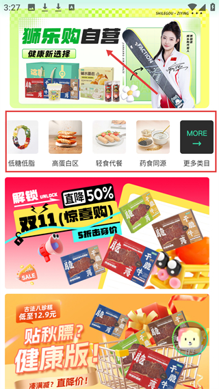 1、首頁,是健康食品自營平臺,有低糖低脂、高蛋白區等分類,還有雙11優惠活動展示,提供健康食品選購服務。