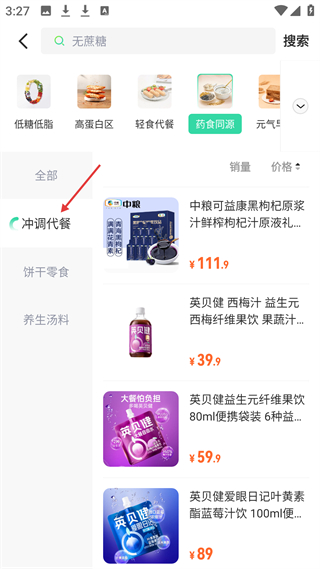 3、藥食同源沖調代餐分類頁,展示中糧黑枸杞原漿、英貝健西梅汁等產品,滿足藥食同源沖調代餐需求。