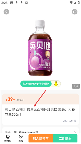 4、英貝健西梅汁商品詳情頁,展示產品圖片、價格和熱量信息,提供加入購物車和立即購買選項,方便用戶選購健康飲品。
