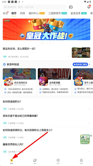 1、進入APP首頁,可瀏覽推薦、熱榜等板塊,查看游戲資訊和問答內容,如游戲搭配、新游早知道等。