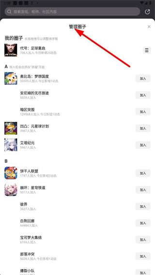 4、進入管理圈子頁面,可查看我的圈子和推薦圈子,如代號足球重啟、奧比島夢想國度等,管理已加入的圈子和發現新圈子。