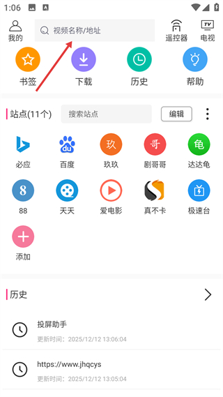 1、首頁,有搜索欄可查視頻,設書簽下載等功能,還有必應百度等站點,能添加新站點,歷史欄顯示近期操作記錄。