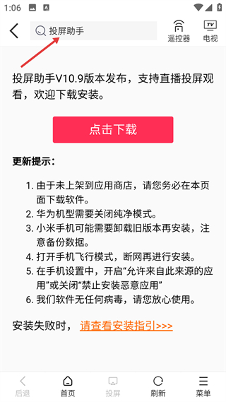 2、投屏助手下載頁,提示V10.9版支持直播投屏,因未上應用商店需在此下載,還列了不同機型的安裝注意事項。