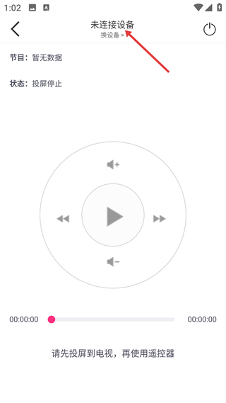 3、投屏控制界面,顯示未連接設備,節目無數據且投屏停止,有播放控制按鈕,提示需先投屏到電視再用遙控器。