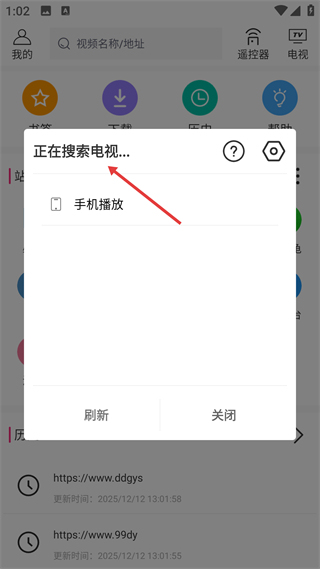 4、電視搜索界面,顯示正在搜索電視,有手機播放選項,底部設刷新和關閉按鈕,可輔助連接對應電視設備。