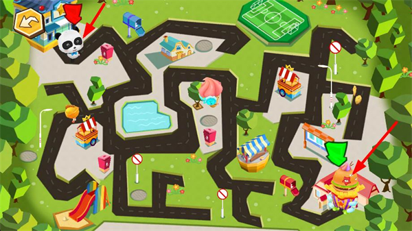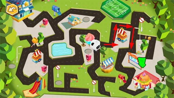 2、進入迷宮式的道路場景,按照指引的方向移動熊貓,朝著目標建筑前進,避開道路旁的標識,推進路線進程。