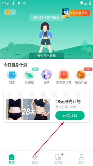 3、在首頁的今日瘦身計劃板塊點擊28天甩肉計劃的開啟計劃,進入計劃詳情頁面。
