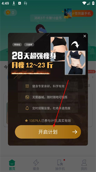 4、在計劃詳情頁面了解28天超強瘦身計劃的優勢后,點擊開啟計劃,開始執行瘦身計劃。
