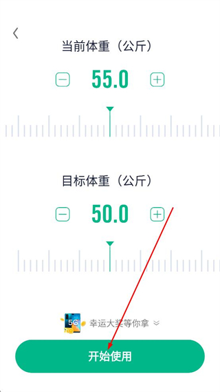 2、在體重設置頁面設置當前體重和目標體重,點擊開始使用進入APP首頁。