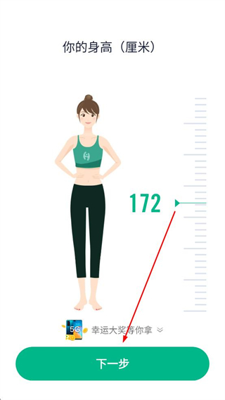 1、打開嗨瘦APP,進入身高設置頁面,設置身高后點擊下一步,進入體重設置頁面。