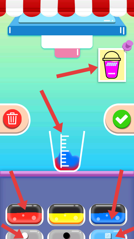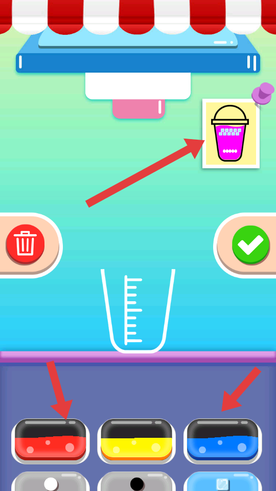 1、游戲開始,查看右上角奶茶圖案,從下方選對應原料,有紅、黃、藍等顏色液體,為制作奶茶備料。