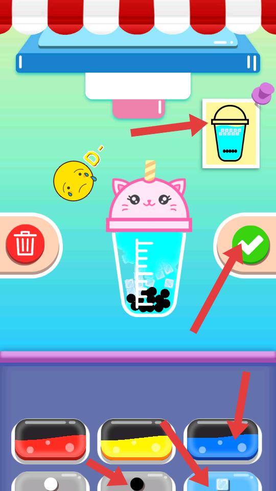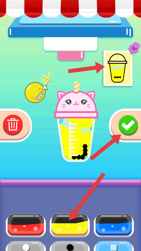 4、若奶茶符合右上角圖案,會出現笑臉,點綠色對勾確認,完成這杯奶茶制作,可繼續下一杯。