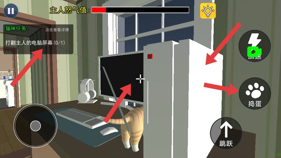 3、操控貓咪在室內行動,根據任務提示,比如要打翻電腦屏幕,利用右側搗蛋等按鈕,嘗試完成任務,同時注意主人怒氣值。