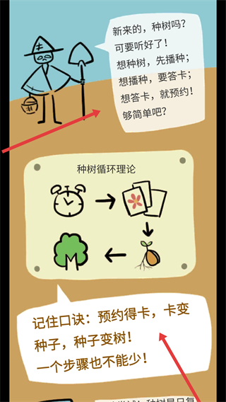 1、種樹需遵循預約得卡、卡變種子、種子變樹的口訣,先預約答卡,再播種,逐步完成種樹流程。