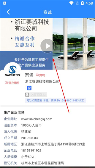 3、在賽誠詳情頁面,查看企業介紹生產企業信息等內容,可點擊播放按鈕查看相關視頻,也能復制企業名稱,還能聯系對應人員咨詢詳情。