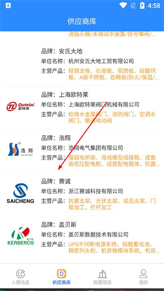 2、登錄后進入供應商庫頁面瀏覽各品牌供應商信息,包括單位名稱主營產品等內容,選擇感興趣的供應商比如賽誠,點擊進入其詳情頁面。
