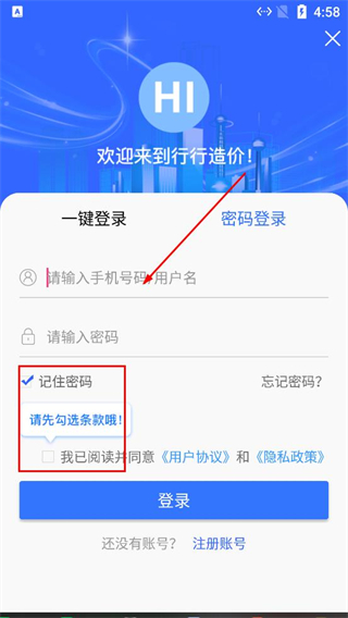 1、進入行行造價登錄頁面,選擇密碼登錄方式,輸入手機號碼用戶名和密碼,勾選記住密碼及用戶協議隱私政策選項,點擊登錄按鈕完成賬號登錄。