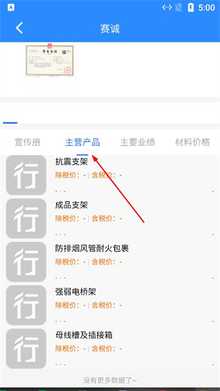 4、在賽誠詳情頁面切換至主營產品標簽,查看抗震支架成品支架等產品信息,了解各產品的除稅價等內容,獲取所需的材料價格數據。