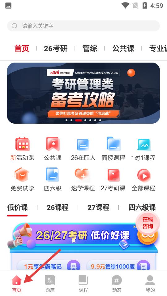 1、點擊首頁,含搜索功能,展示考研管理類攻略,提供新活動課、免費試學等課程,突顯低價課活動。