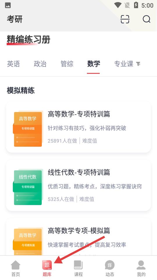 2、點擊題庫界面,設精編練習冊分多科目,模擬精練含高等數學、線性代數等專項訓練,顯示參與人數和難度。