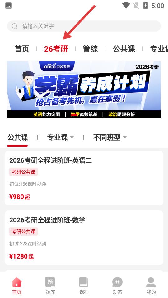3、點擊26考研課程頁,推出學霸養成計劃,呈現公共課、專業課全程進階班,標明價格與初試課時數。