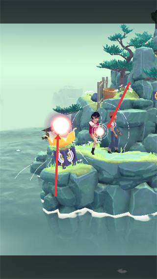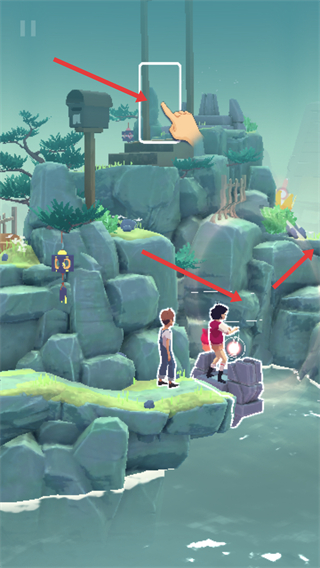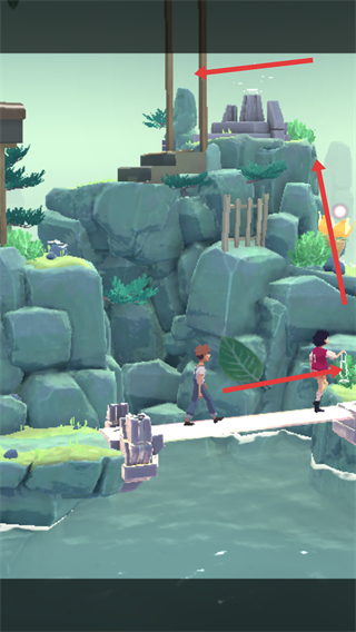 2、沿著巖石路徑前行,跟隨指引操作,讓角色到達指定位置,與場景的裝置等互動,解鎖新區域。