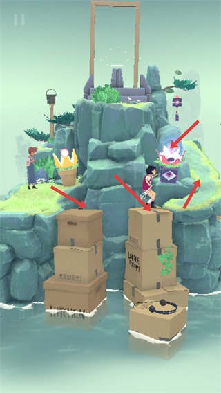 4、在有紙箱堆疊的區域,操控角色在紙箱上移動,與發光物體等互動,利用場景元素解開謎題,推進游戲。