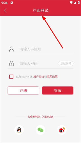 3、立即登錄界面輸入手機號和密碼,勾選用戶協議和隱私政策后點擊登錄,也可選擇企鵝、微信、微博等快捷登錄方式,若忘記密碼可點擊忘記密碼找回。