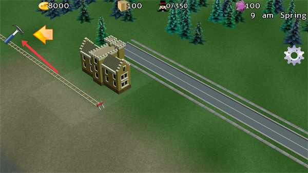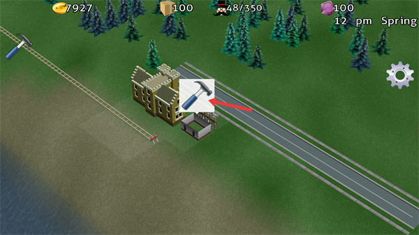 1、游戲界面顯示有錘子等圖標,還有房屋、道路等元素,此時要留意錘子相關提示,它是建造或操作的關鍵工具,結合資源數量為后續建造做準備。