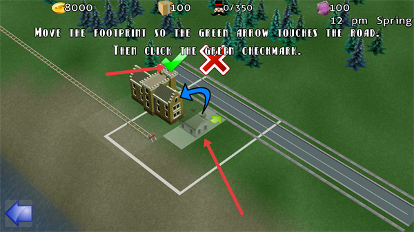 3、界面提示移動建筑的占地面積,讓綠色箭頭接觸道路,需按照指引移動建筑位置,使綠色箭頭與道路銜接,完成后點擊綠色對勾確認。